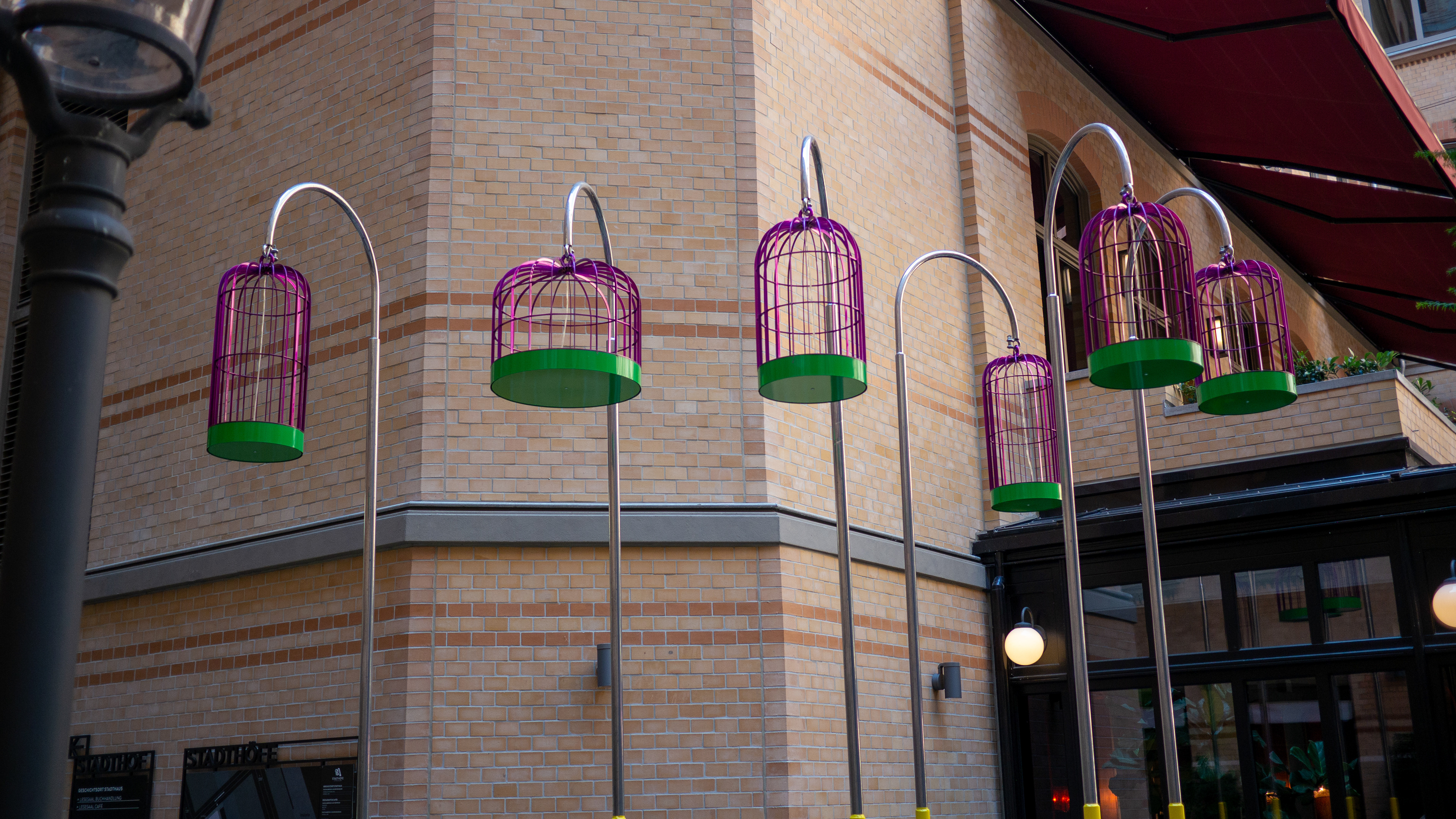 Speakers placed into the cages reproduce different sounds of extinct birds, their timing and frequencies are determined by a random composition as in the original. The resulting piece consists of 80 % silence.