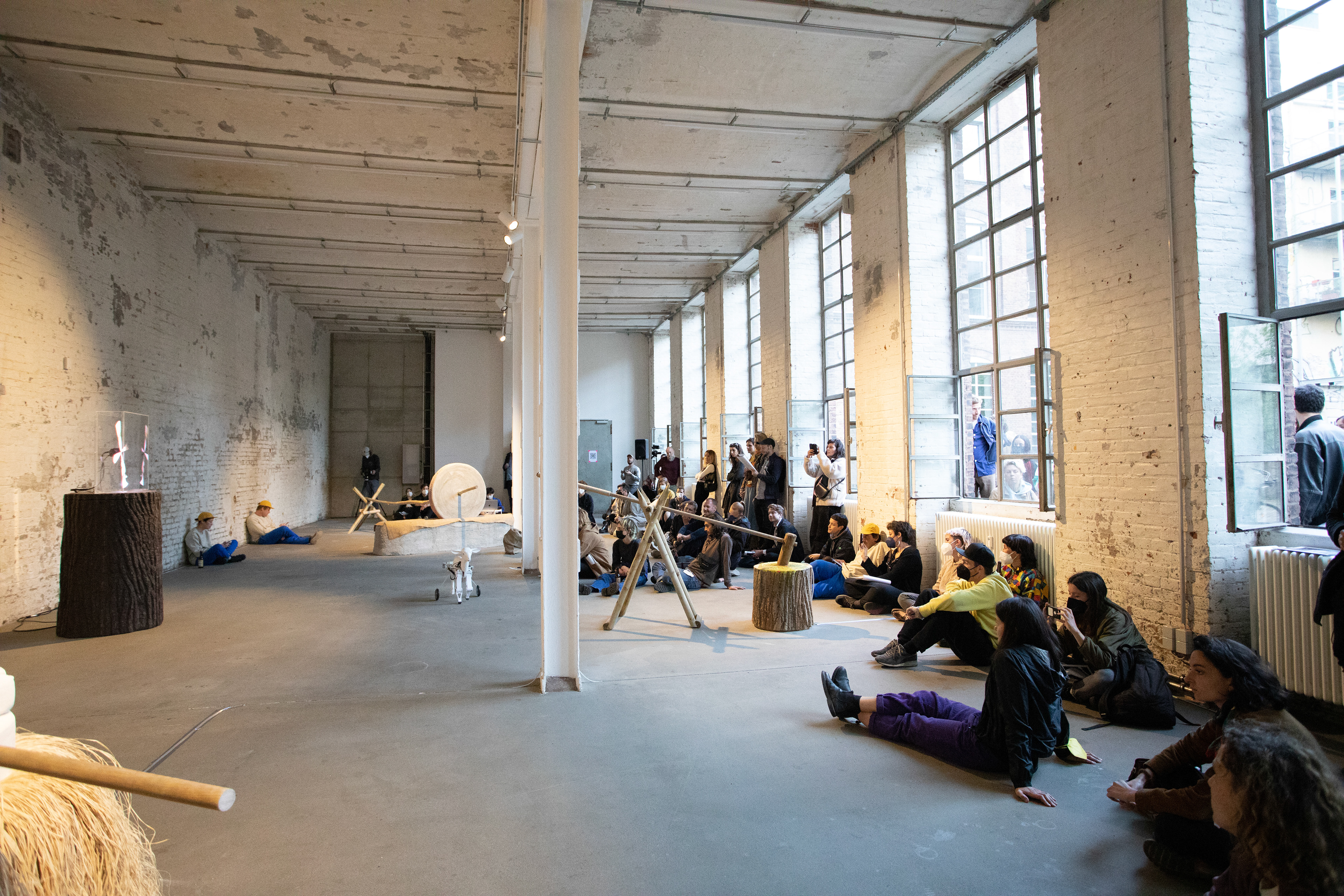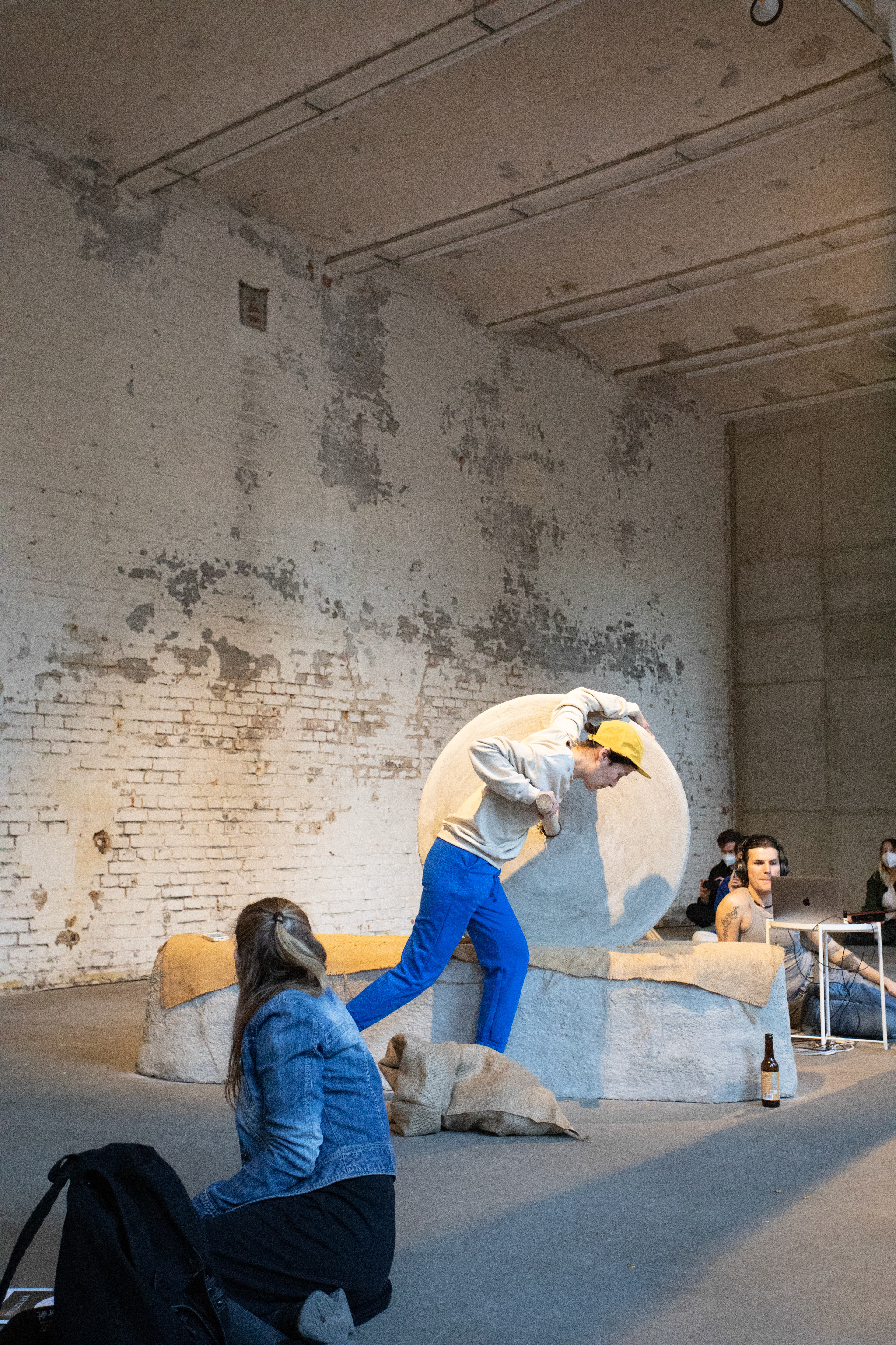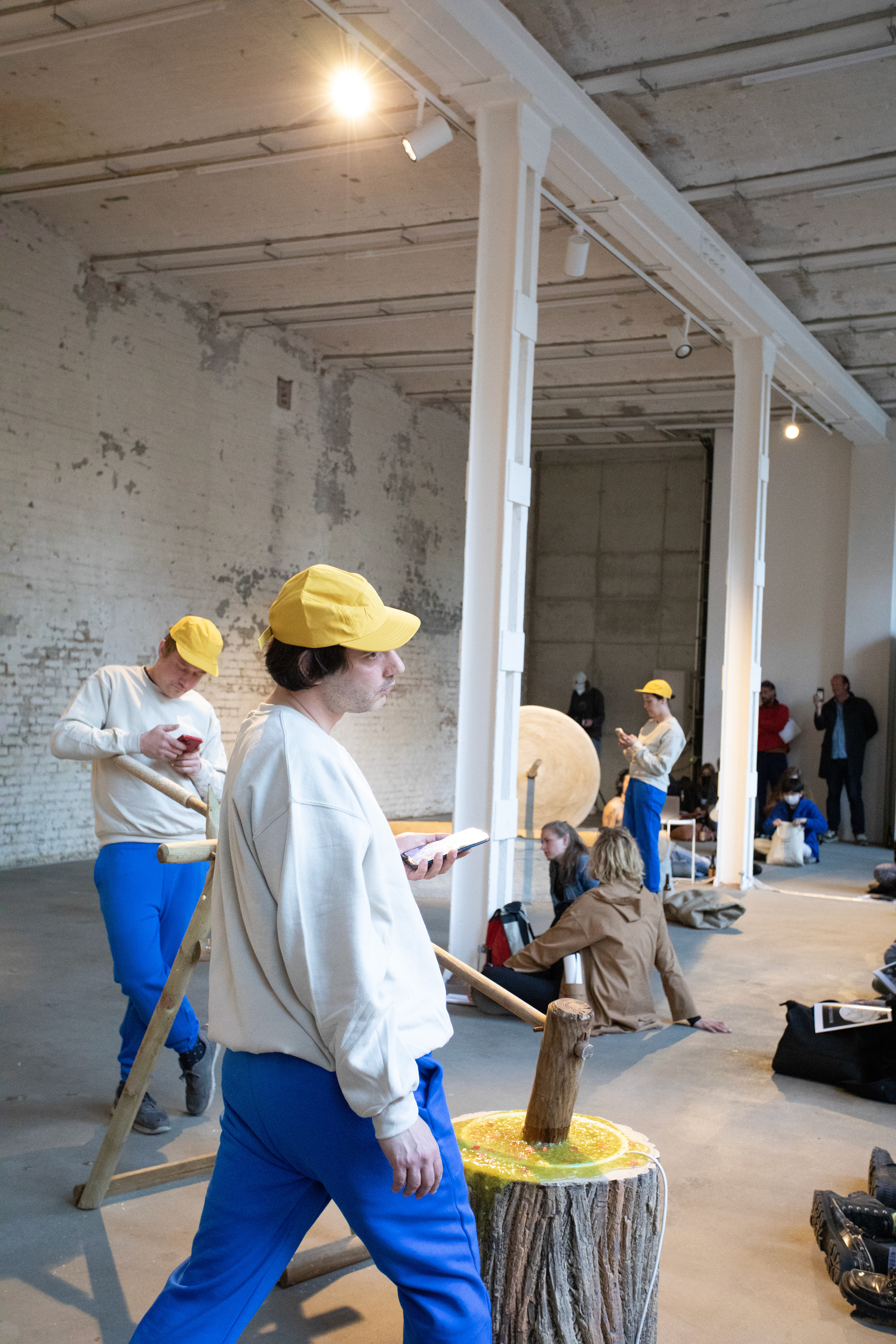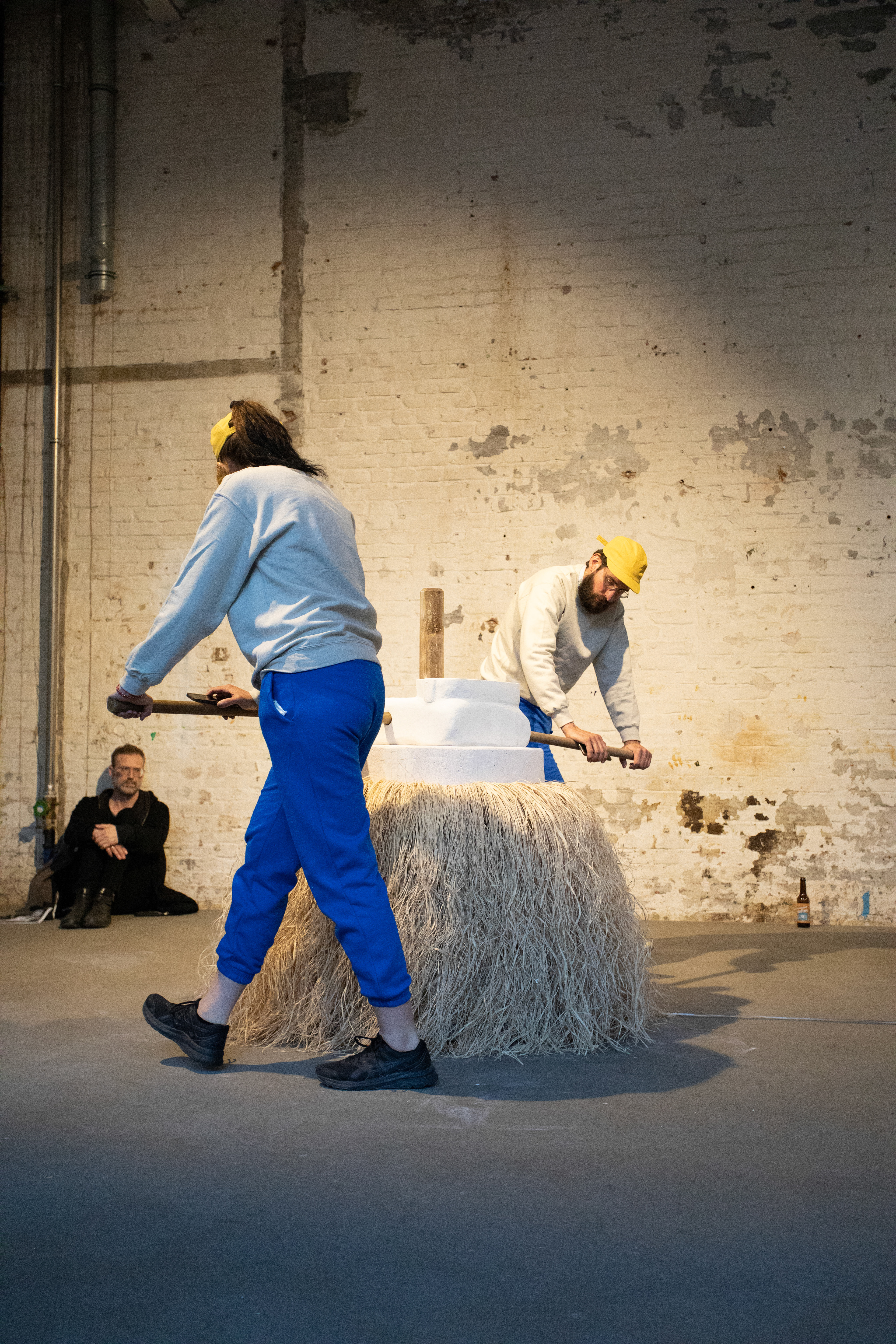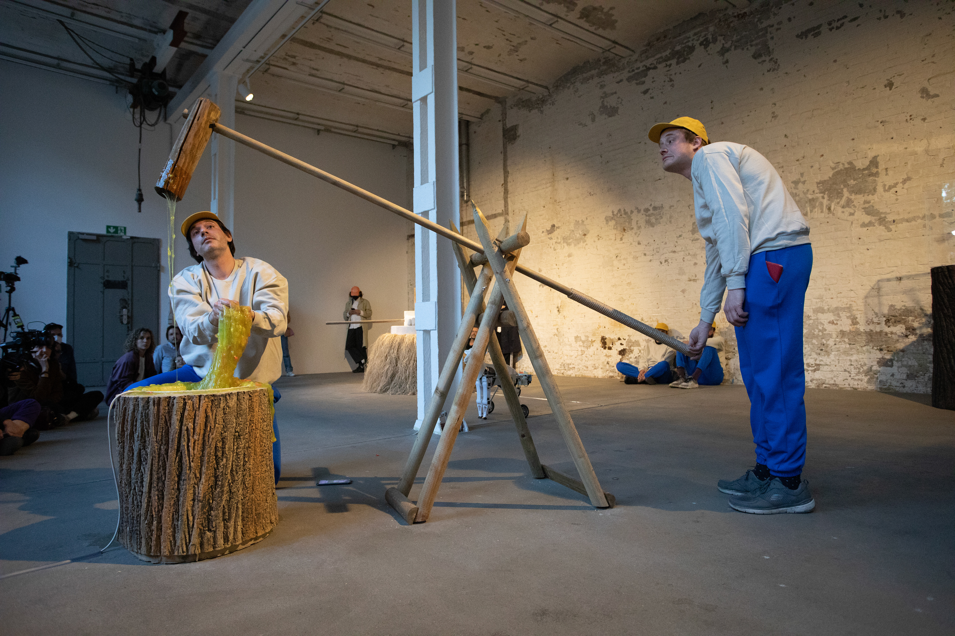 The romanticism of the Alps contrasts with the comic-like, distorted working world of the gig economy. Under the watchful eyes of the goat and the hologram, performers produce useless things on archaic-looking apparatuses and, as a by-product, noises for the soundscape in the Great Hall of the REAKTOR.