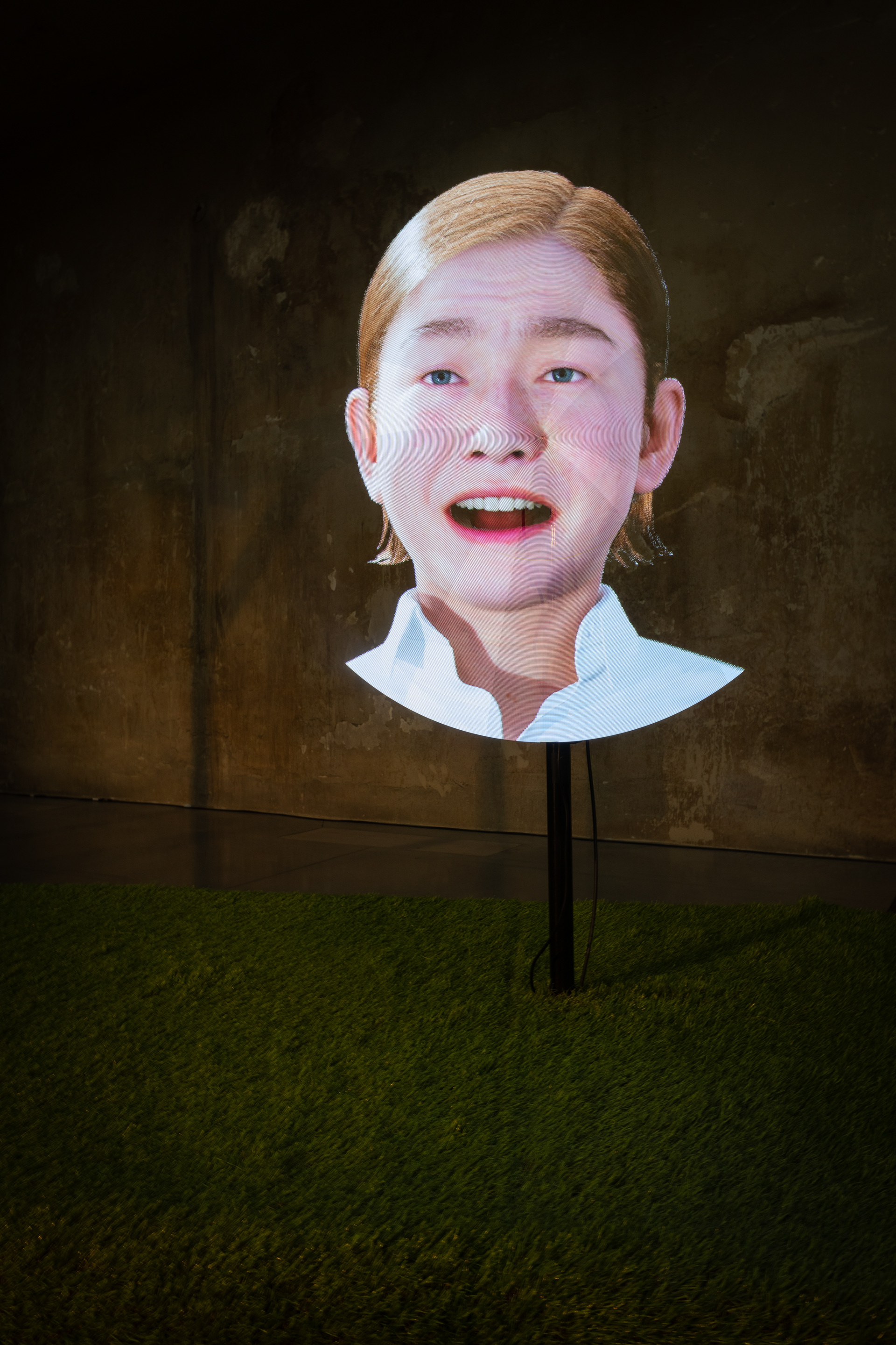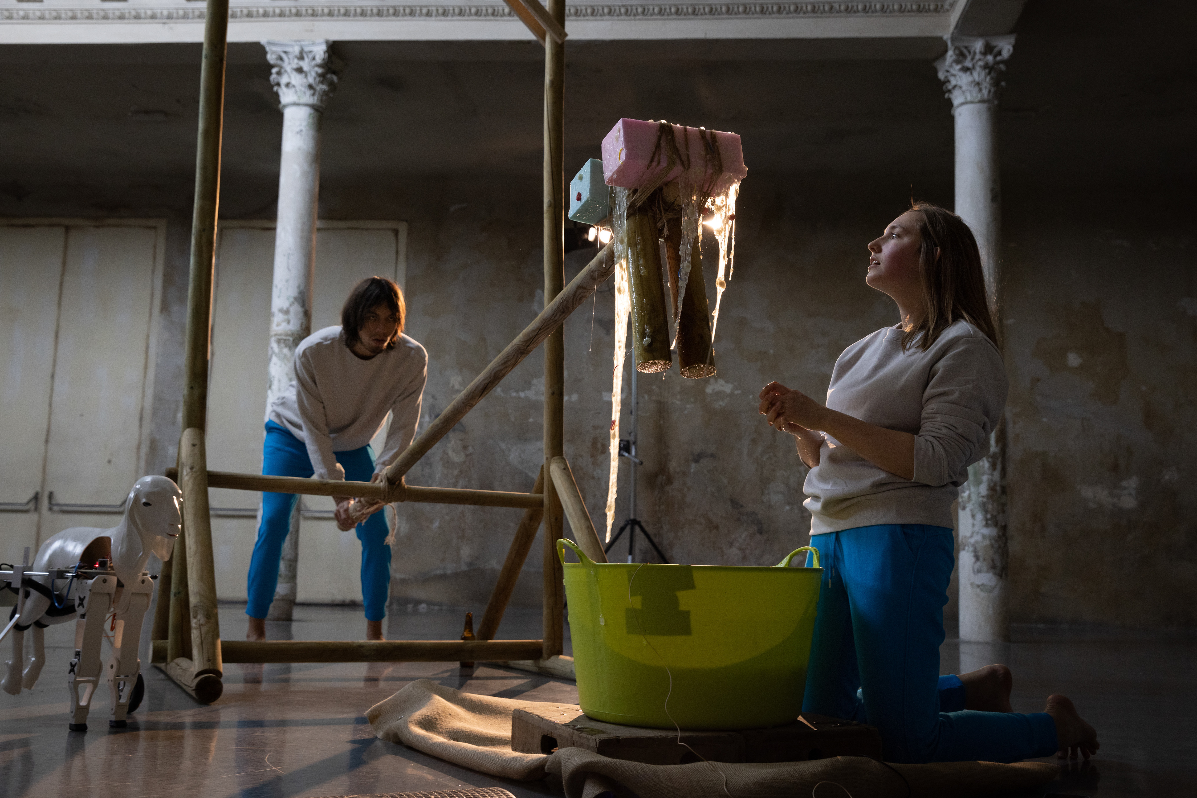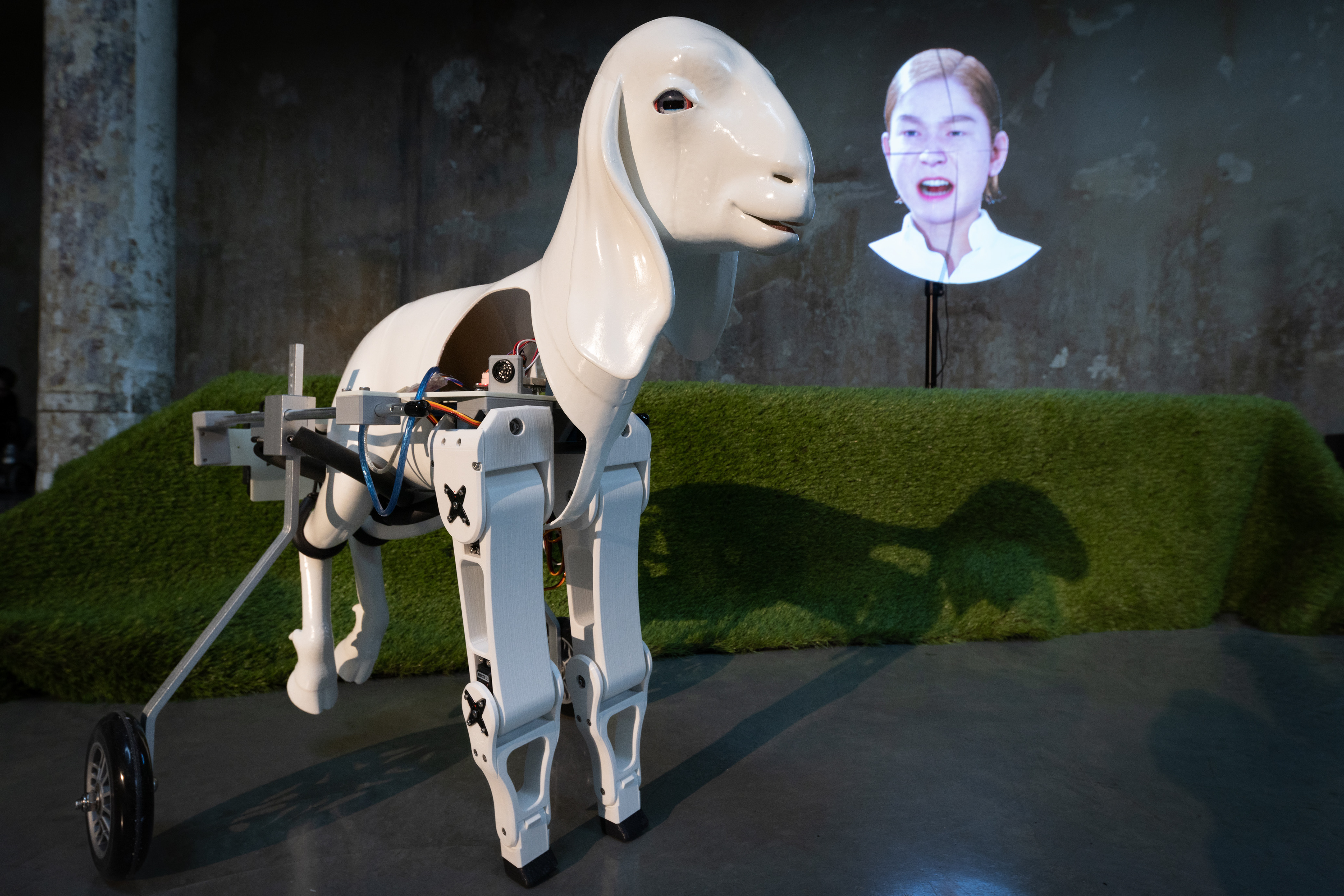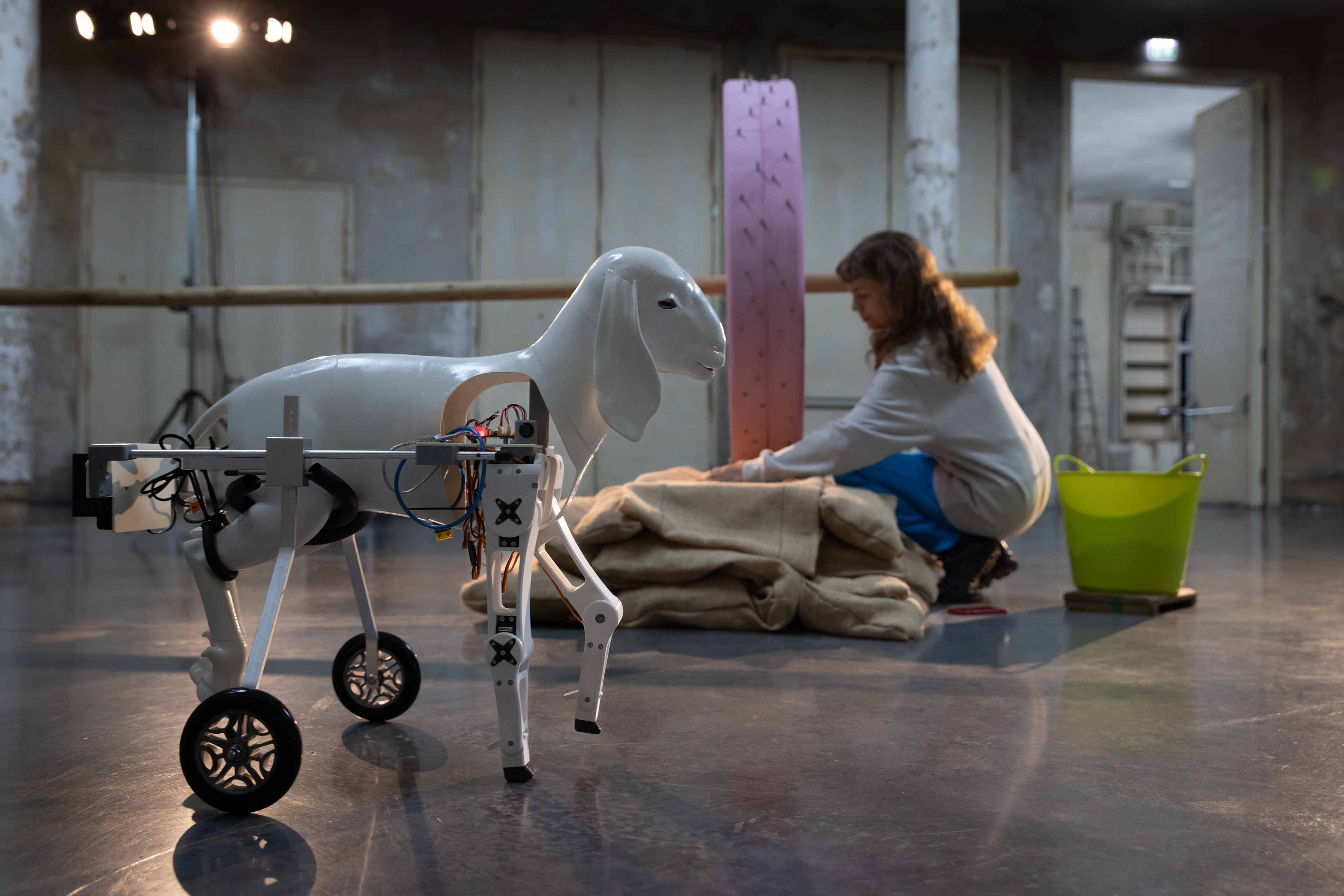 In keeping with the hybrid authorship between the artist and the AI of the libretto, the vocal interpretation of the texts is also created in the interplay between a collective of previously recorded singers and a robotic goat as well as a hologram, which as vocal mediators give the recordings a performative body.