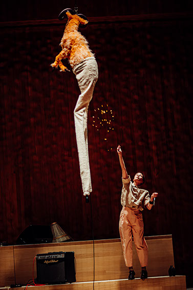 4 performers, trombone, electronics, baby timpani, bells, fake goat with pants, self-made instruments